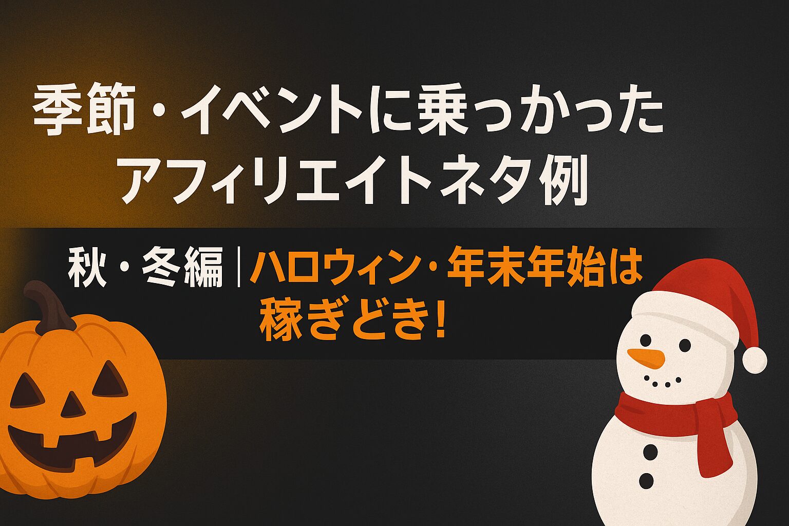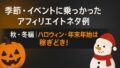 収益・アクセスアップ 季節・イベントに乗っかったアフィリエイトネタ例|秋・冬編|ハロウィン・年末年始は稼ぎどき! アフィリエイトって、ネタ切れとの戦いだったりしますよね。でも、実は身近にヒントはたくさんあるんです。それが「季節」や「イベント」。特に秋から冬にかけての時期は、ハロウィン・クリスマス・年末年始・バレンタインなど、“消費が動く”イベントが目白... 2025.10.07 アフィリエイト収益・アクセスアップ記事の書き方